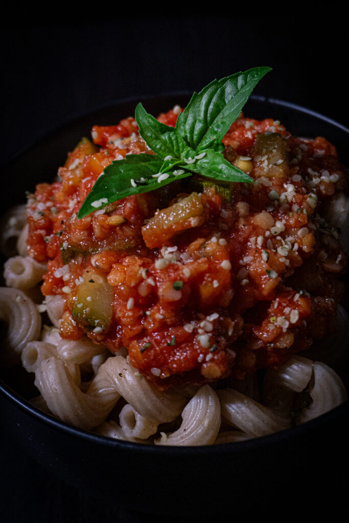- Mittagessen: Vollkornnudeln mit Linsenbolognese