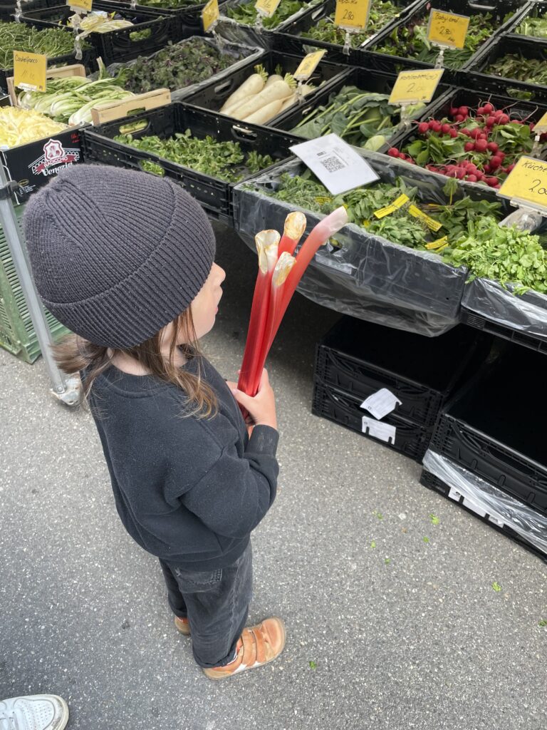 Ich liebe es, mit meinen Kindern gemeinsam den Markt zu besuchen. Die kleinen Händchen greifen nach dem pinken Rhabarber und wird zuhause direkt zu Rhabarberwähe verarbeitet. Es sind diese kleinen Momente, die Essen so lebendig machen.